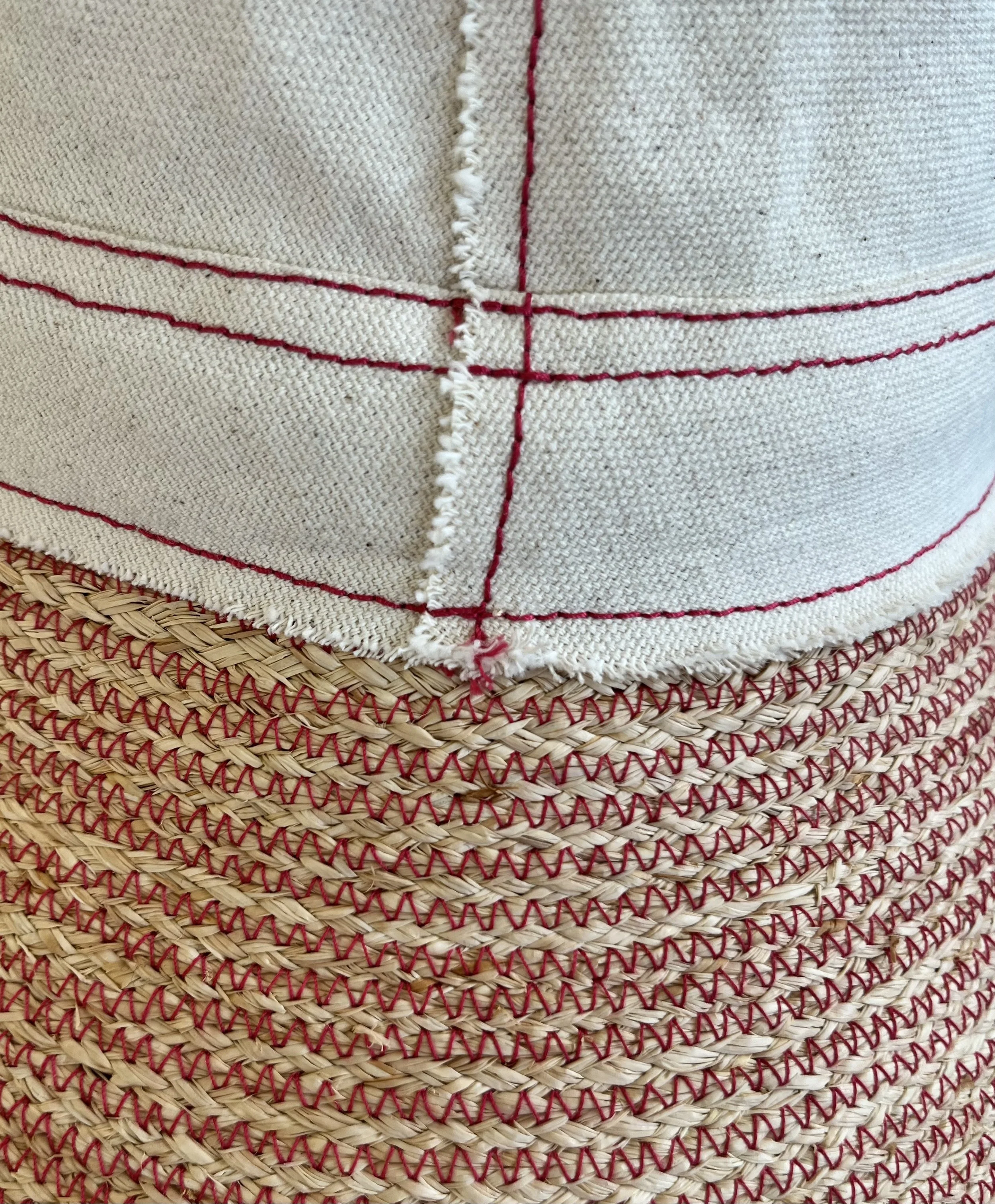 A classic bucket is updated by the use of hybrid materials. The crown is made of a cotton sailcloth canvas with raw edges and stitched in a contrast color. The medium sized brim, soft and pliable, made of raffia tape is zigzag-stitched in the same color. This is a great travel hat!