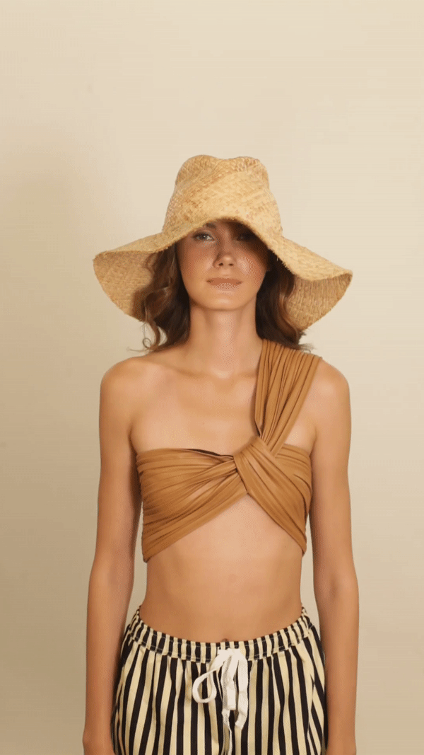 With its defined fedora crown and wavy brim, the Commando is our most sought-after hat. Two layers of raffia top-stitched together make it pliable and UV protective. A leather tab secured with a brass rivet over the center back pleats allows the crown to be adjusted to the wearer’s exact headsize.