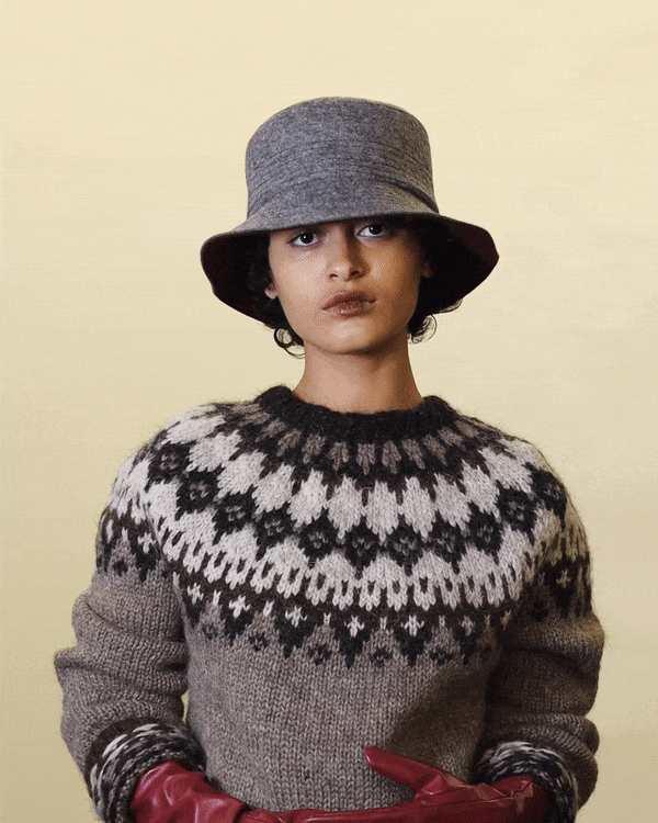 This unconstructed wool felt bucket has top-stitching on the brim, which continues for a few rows onto the crown. The under brim is in a contrast color. Highly pliable and great for traveling, the hat is especially warm because the felted fibers prevent too much air from passing through.