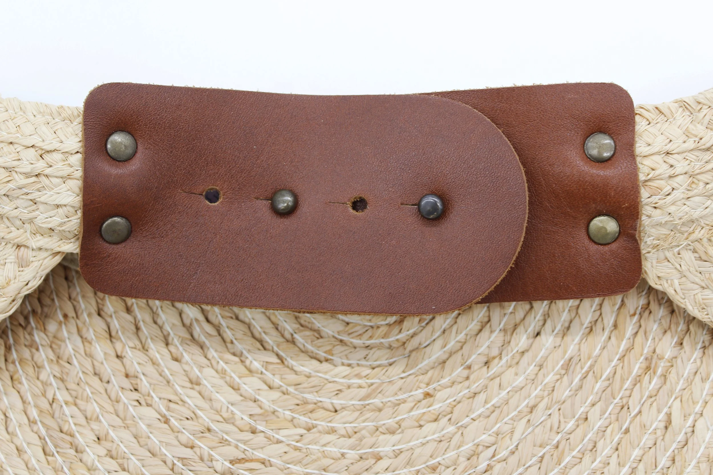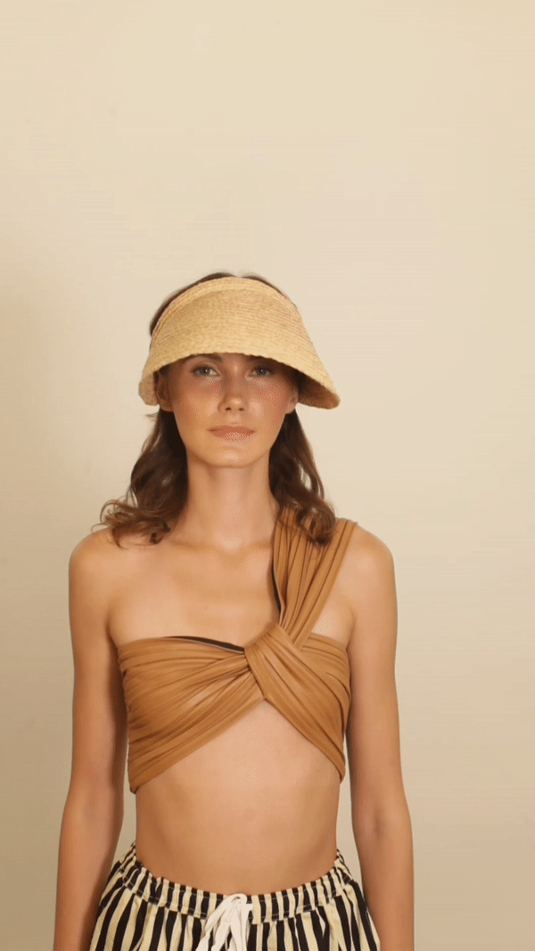 A simple silhouette with a super-chic oversized leather closure. Brass rivets let the wearer adjust the Marquee to her exact size, and the wide peak, made by stitching ¼” raffia tape into semicircles, provides generous shade.