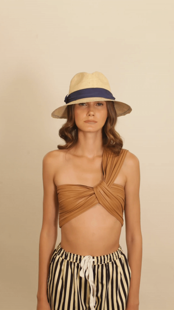 Made of sturdy, straw like paper and trimmed with a casually double-wrapped washed grosgrain, this fedora is equally suitable in town or at the beach. The slightly downward-sloping brim is edged with a few rows of free-form stitching in the same color as the trim. The size can be adjusted by tightening or releasing a narrow ribbon inside the crown.