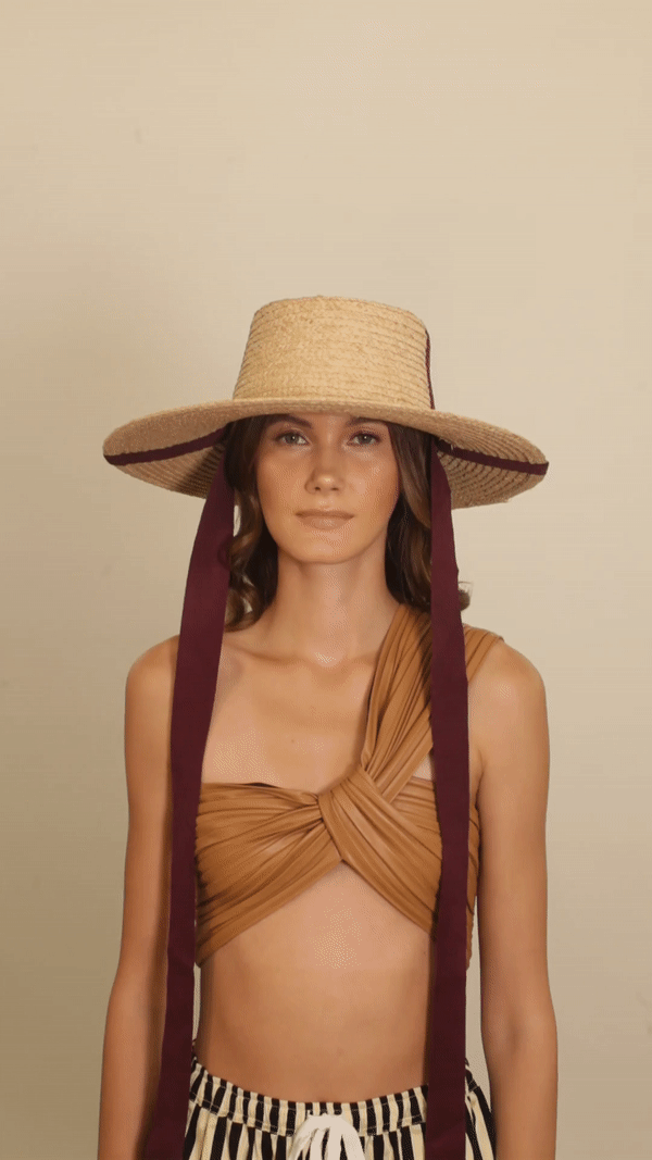 Shadow Line is a flat-brimmed planter-style hat. Stitched of slightly overlapping raffia tape for structure and sun coverage, it has grosgrain ribbons starting at the crown and running down the sides and along the top and bottom of the brim to end into chin ties.