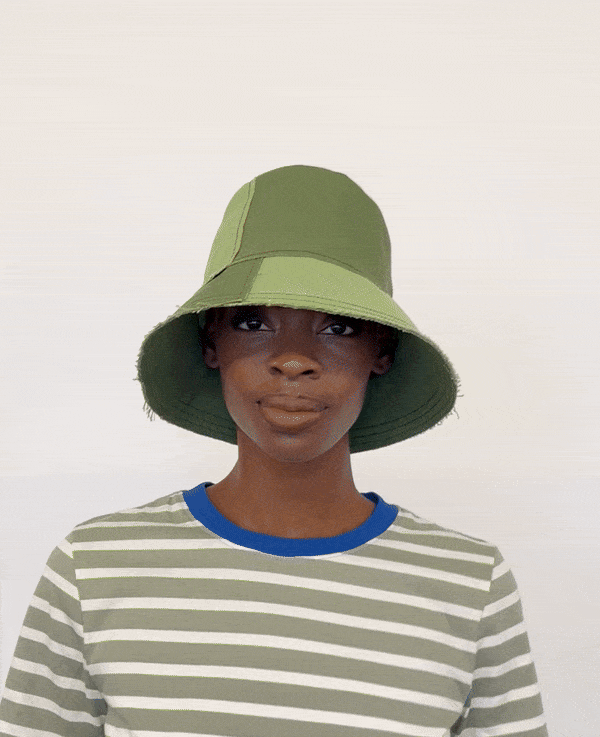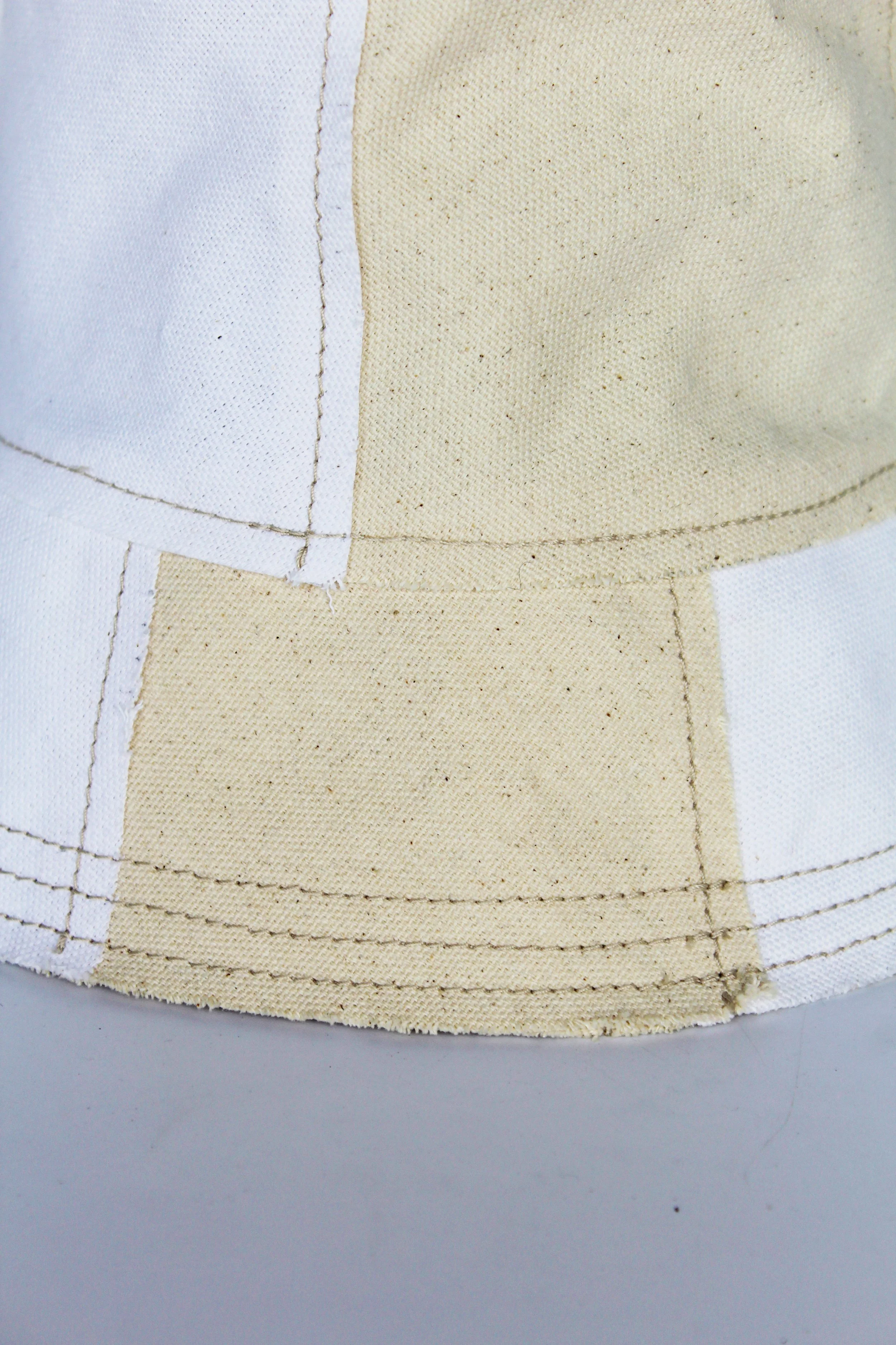 Canvas panels of different sizes and colors are sewn together to form the crown and brim of this bucket. Edges are left unfinished, and the result is an effortlessly chic and casual lightweight hat that's perfect for summer days.